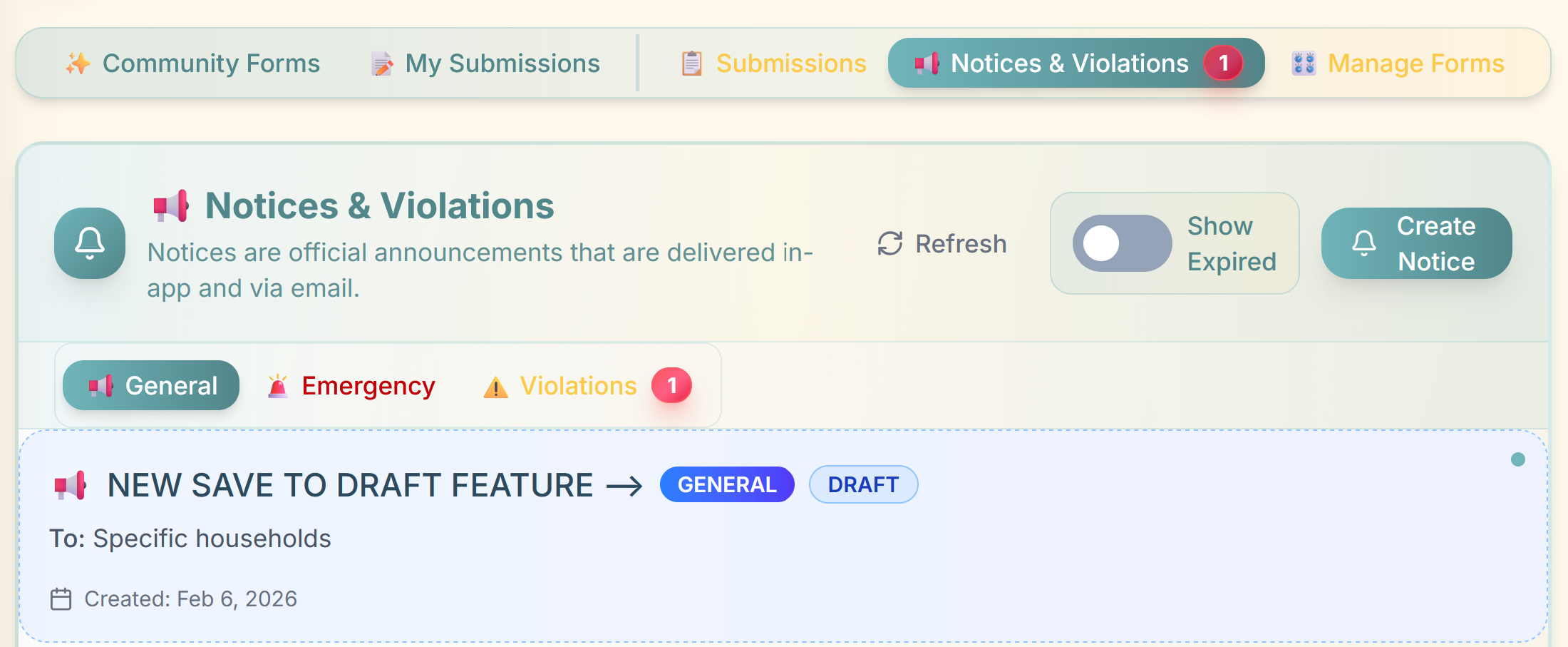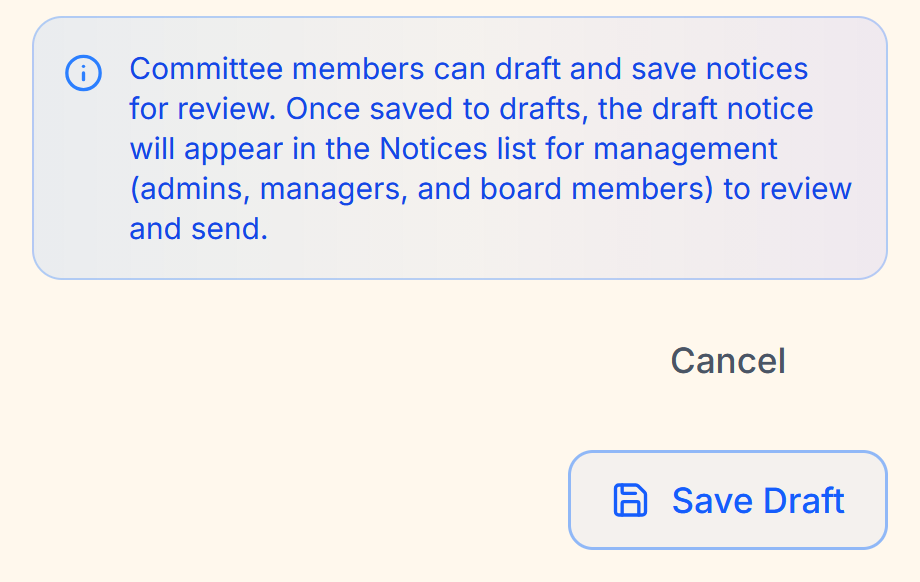 As the buck ultimately stops with the board, it is important to enforce certain restrictions on people who have not been elected or hired by the community, while still being grateful for anyone who is willing to help out. As part of this, committee users can Create and Write an official Notice, but they do not have the ability to send. Instead they can Save Draft, and a board member or manager then can review it, approve it, and send it out.