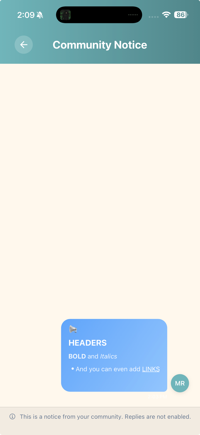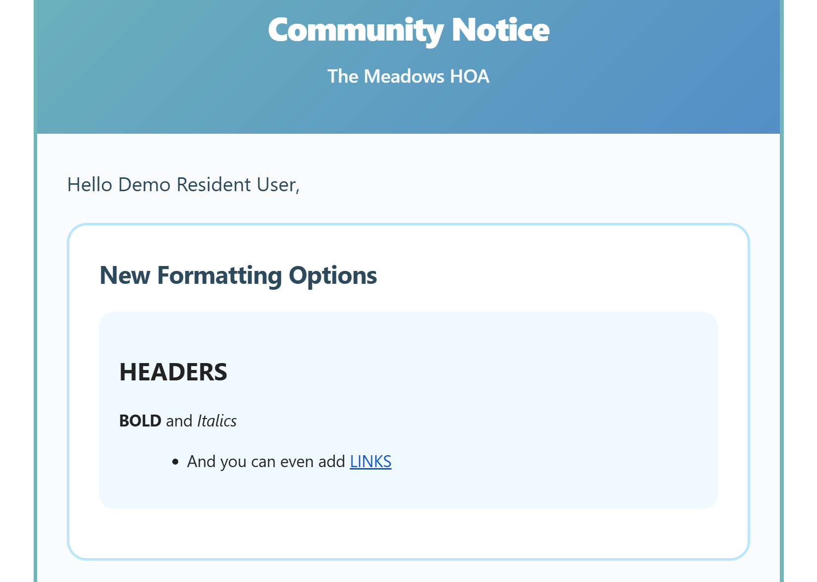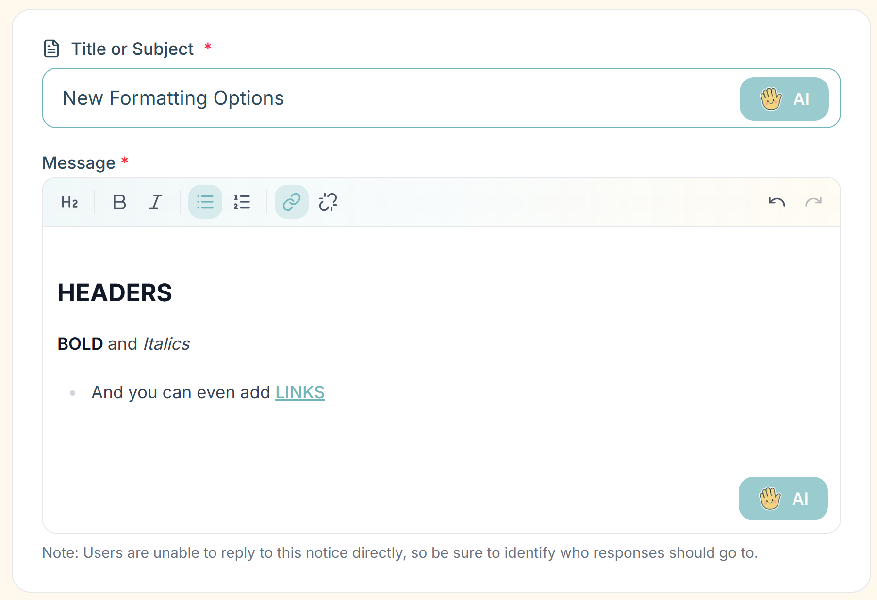 We have rolled out basic text formatting features for notices, updates, and events. You now have the ability to bold, italicize, and add links:
